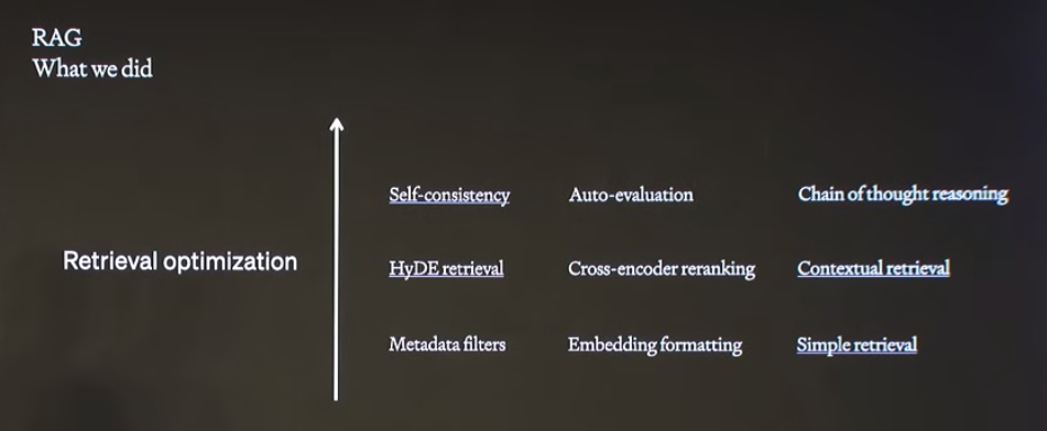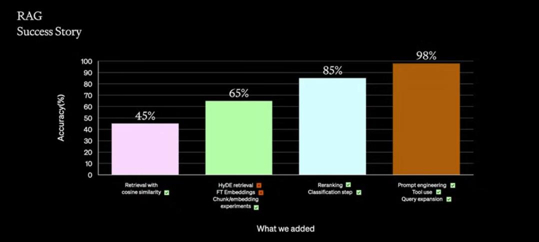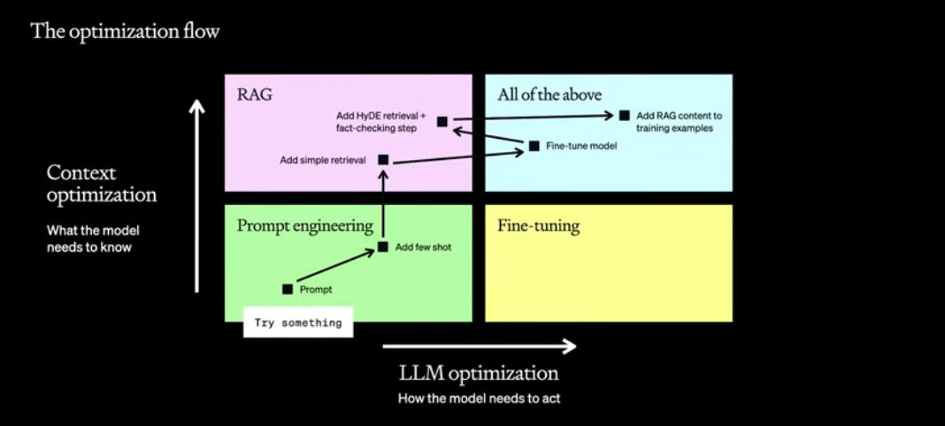 The path isn’t necessarily linear, you usually start off with prompt engineering, use few-shot examples, then you notice the issue is in knowledge – so you add retrieval, then the format of answering isn’t right – so you do fine-tuning, then you go back and improve retrieval with HyDE and fact-checking and so on…